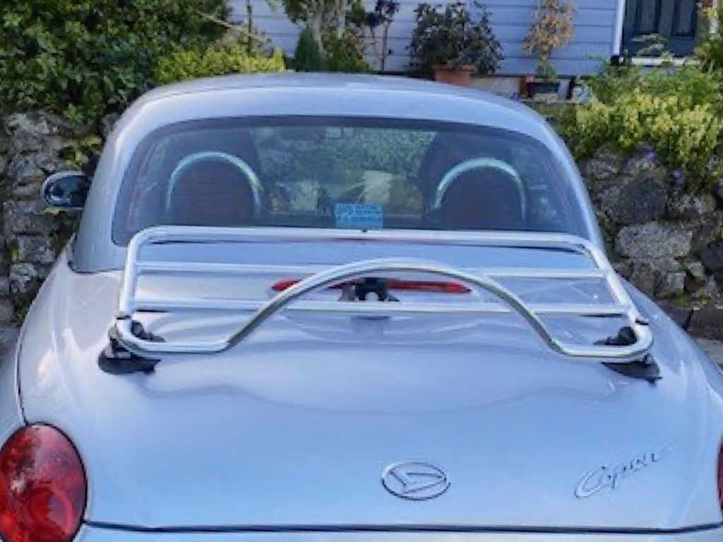 Gepäckträger Daihatsu Copen Juli 8, 2024 • 1024 × 768 • Daihatsu Copen Gepäckträger silberner Daihatsu Copen mit einem am Kofferraum montierten Revo-Rack PA-Gepäckträger, nah von hinten fotografiert