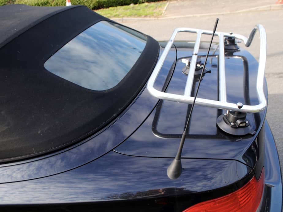 black bmw e93 3 series cabrio with a luggage rack fitted carrying a black bag