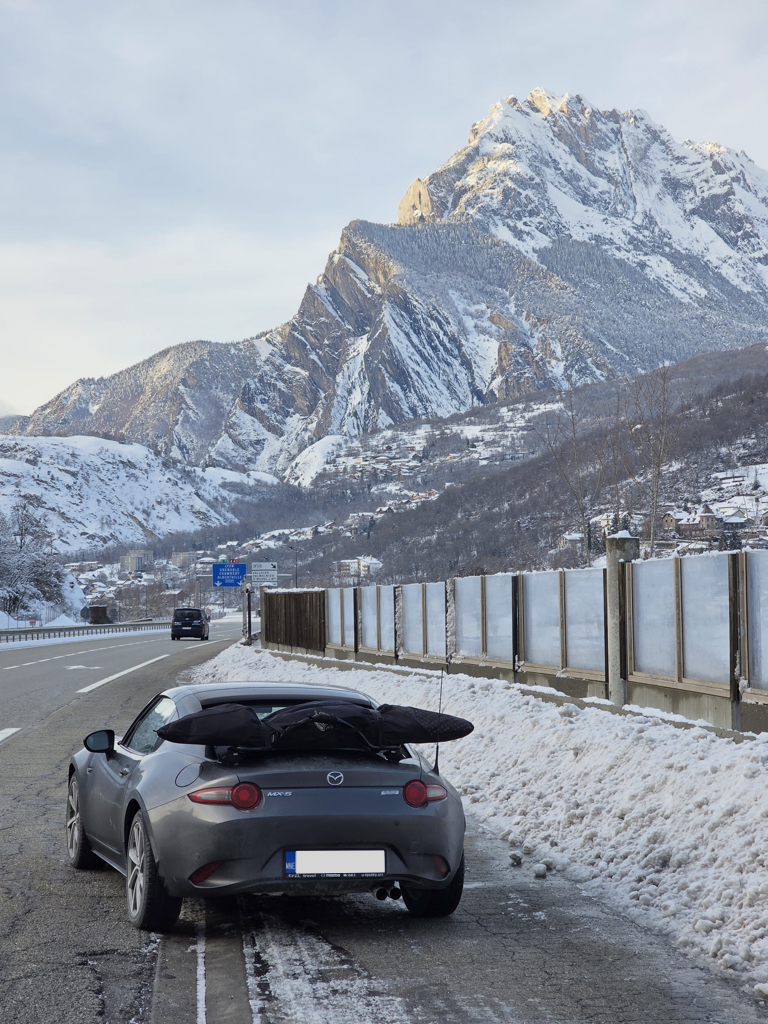 graphite mazda mx5 rf parked in a lay-by net to mountains with snow on with a revo-rack luggage rack fitted carrying skis and snowboard