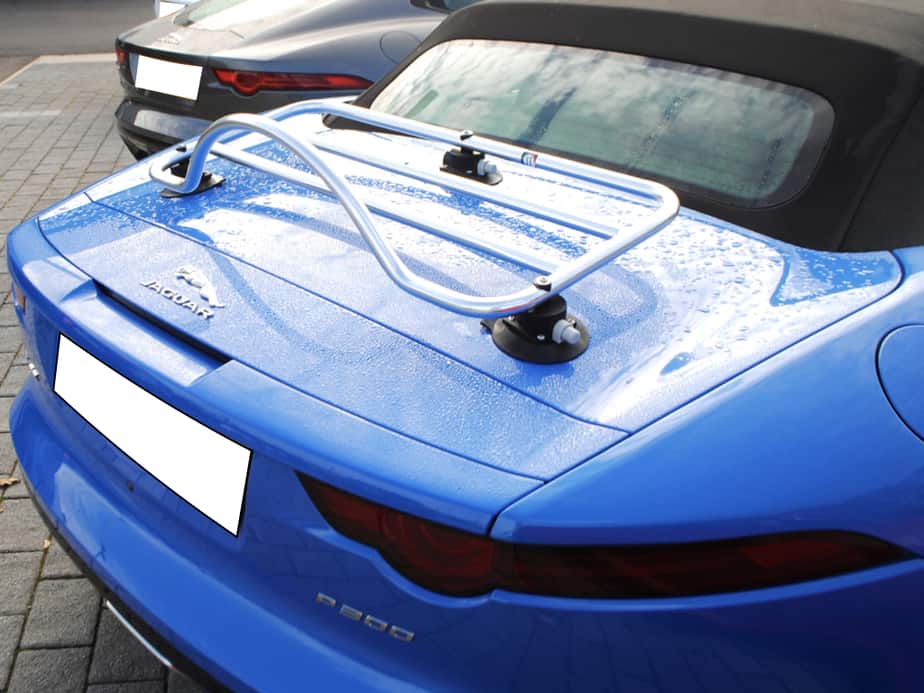 blue Jaguar f type convertible with a luggage rack fitted carrying a large case