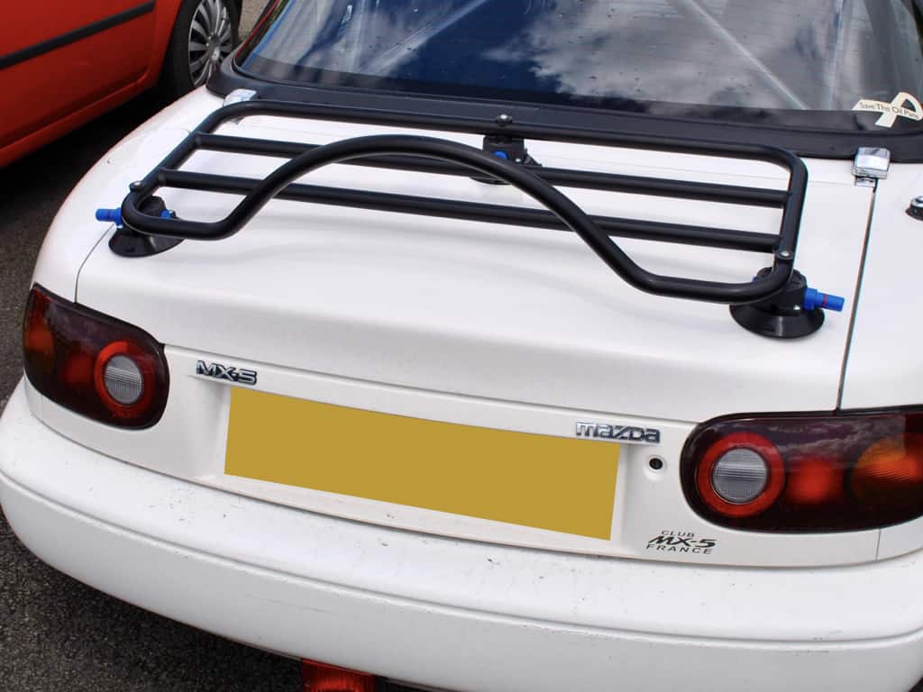 grey mazda mx5 nc with a revo-rack luggage rack fitted photographed from the rear