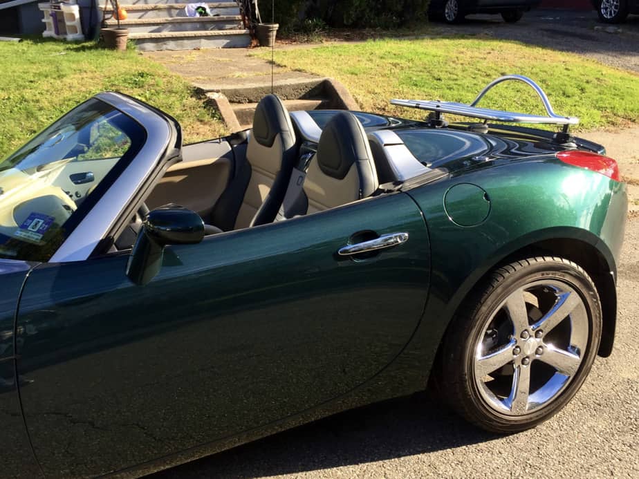 red pontiac solstice with a luggage rack fitted photographed from the rear