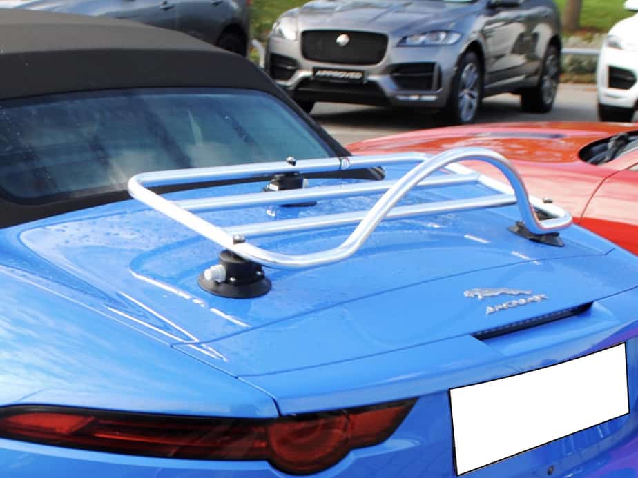 blue Jaguar f type convertible with a luggage rack fitted carrying a large case