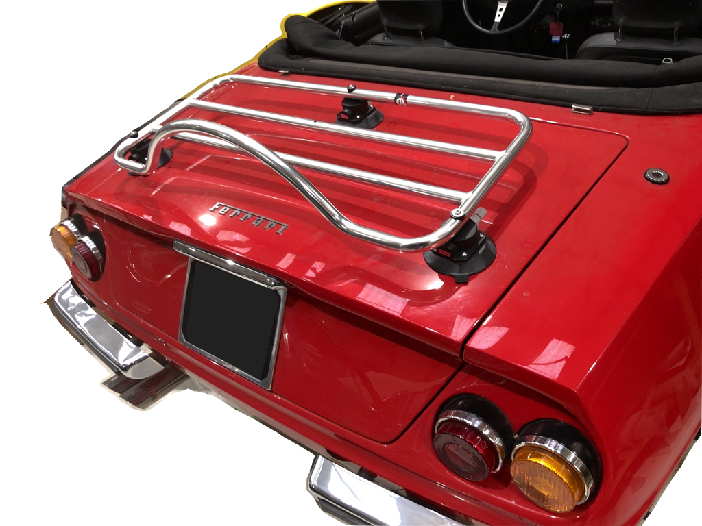 Ferrari Daytona 365 GTB/4 Spider cabriolet rouge avec un porte-bagages revo-rack pa installé photographié près de l’arrière