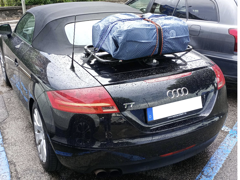 zwarte audi TT Roadster met een revo-rack bagagerek gemonteerd met een blauwe koffer gefotografeerd van achteren in de regen