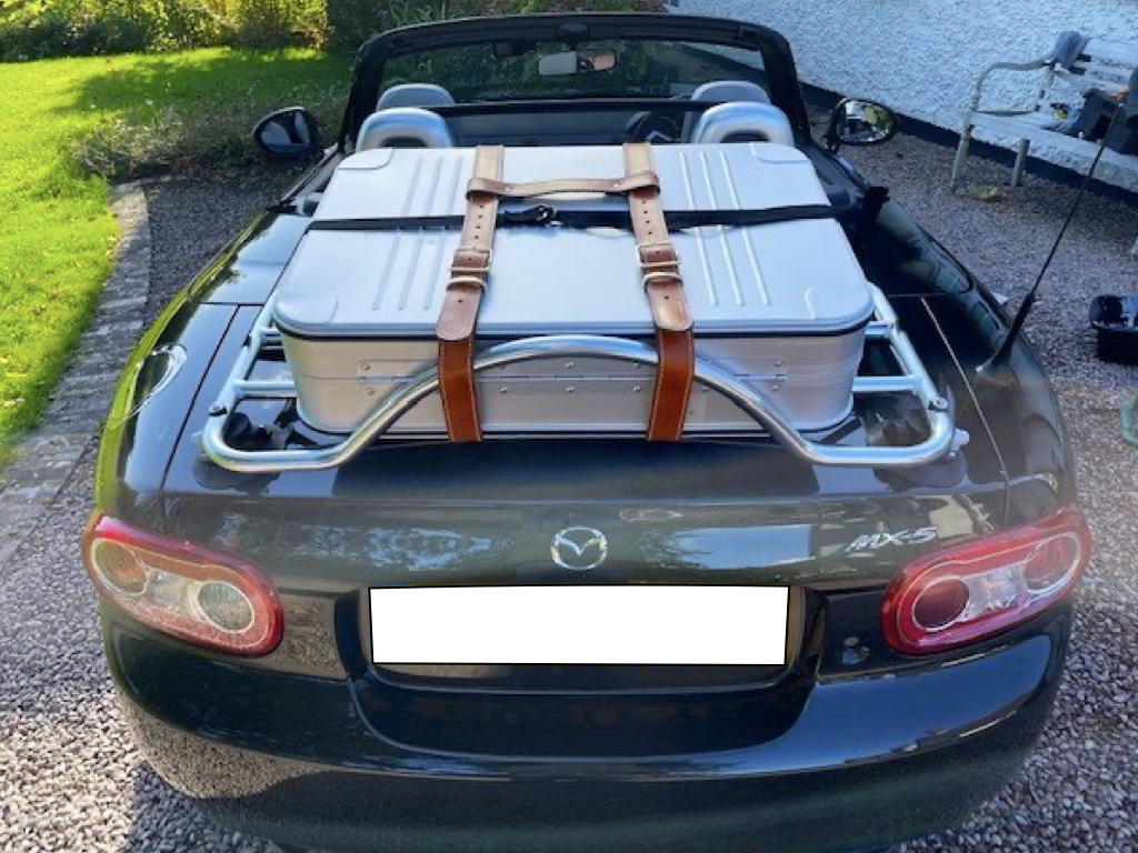 grey mazda mx5 nc with a revo-rack luggage rack fitted photographed from the rear